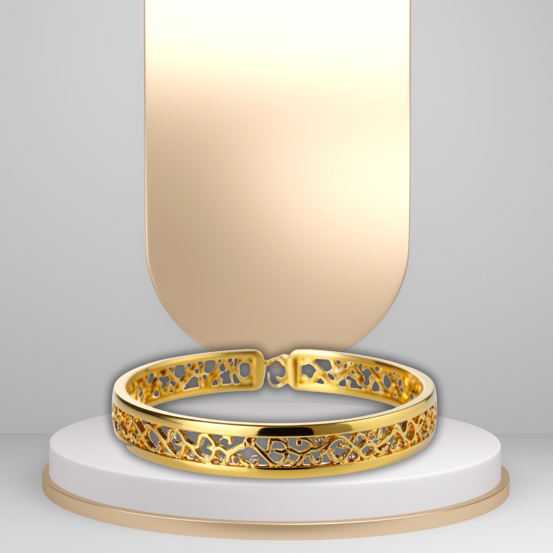 This exquisite yellow gold bangle features an intricate, laser-cut “lace” pattern of floral and vine-like motifs. Tiny diamonds are scattered throughout the filigree for a subtle, sophisticated sparkle.