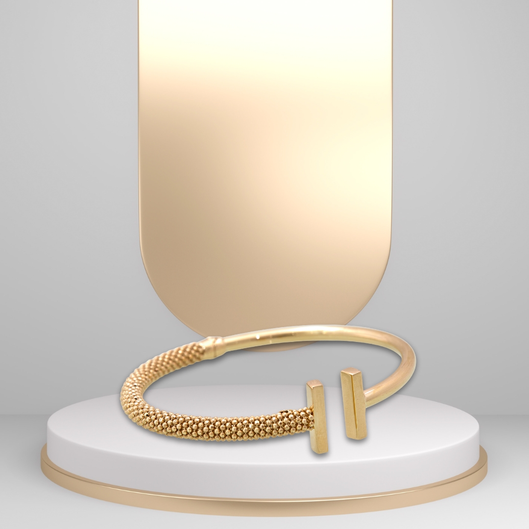 A modern take on the bangle, this yellow gold cuff features a unique split-texture design. One half is smooth and polished, while the other is finished with a dense, beaded “caviar” texture, ending in two sleek rectangular bars.