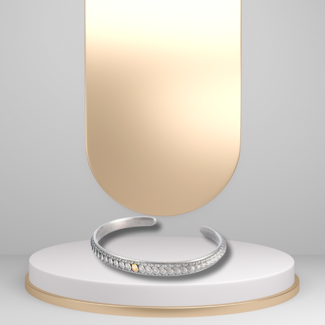 A rustic yet refined sterling silver cuff with a hand-engraved feather or wheat pattern. A single, small 18k gold stud provides a warm contrast to the cool, oxidized silver tones.